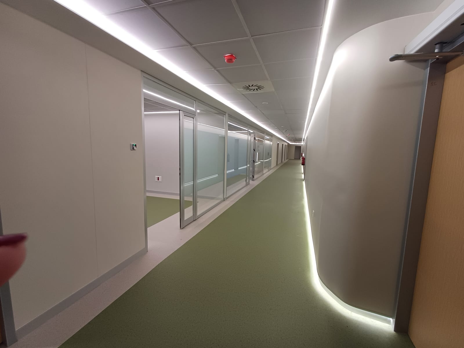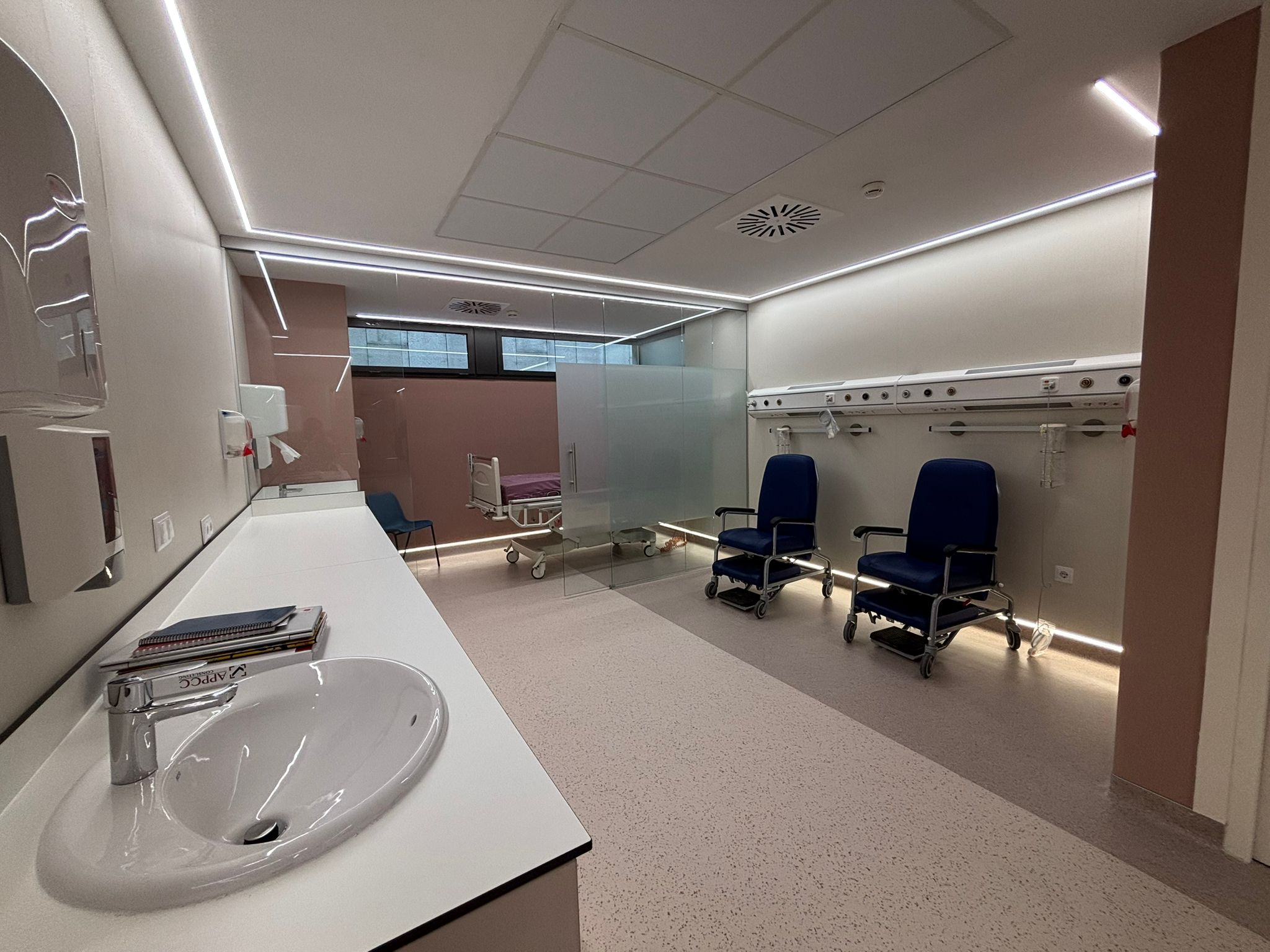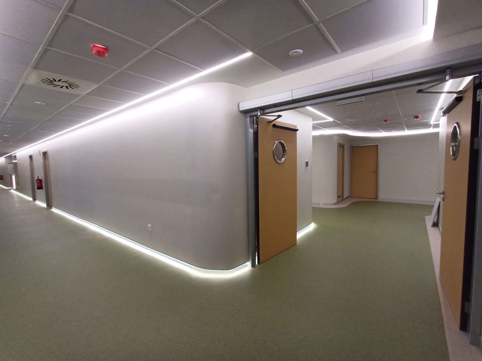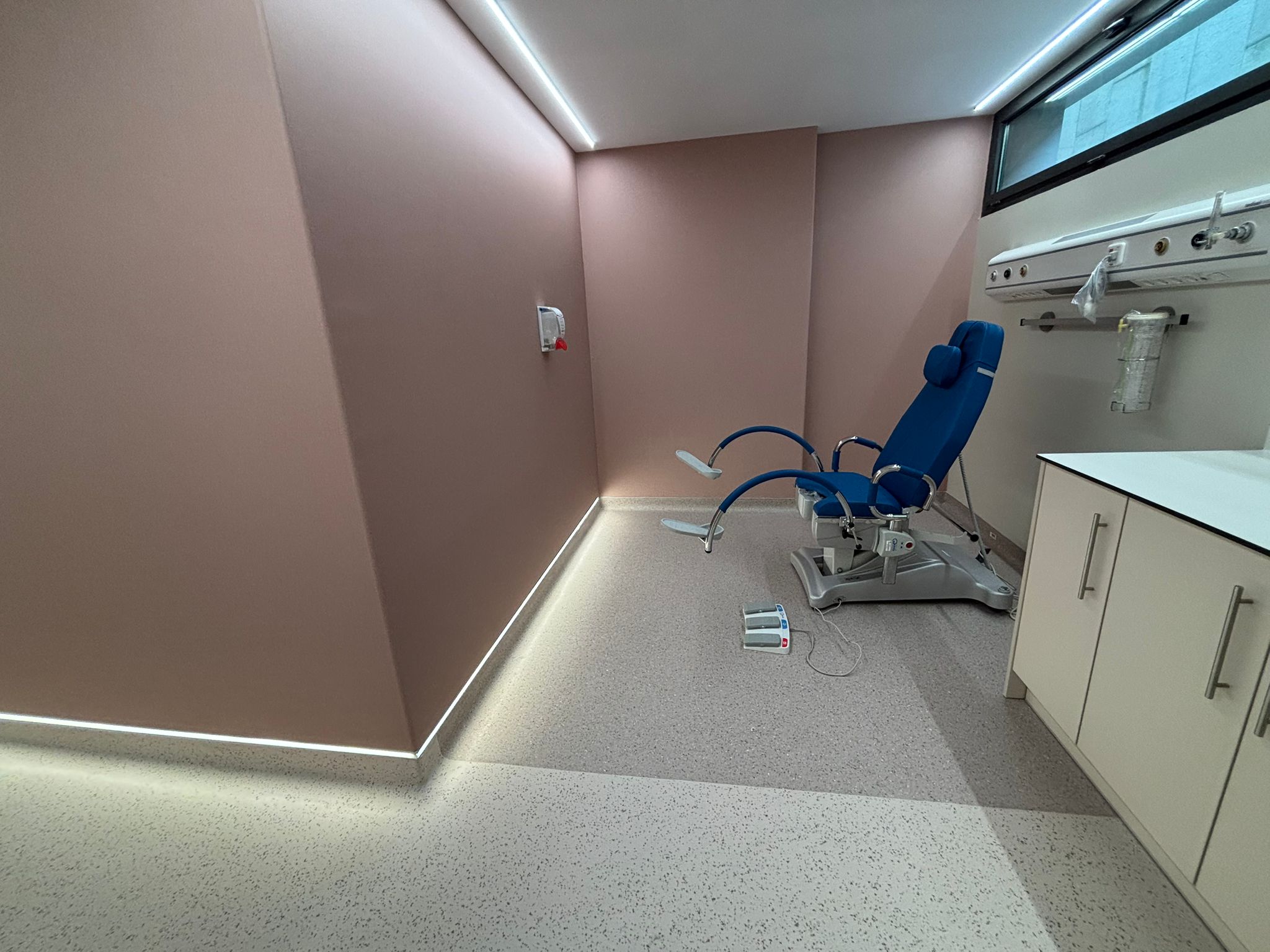 Área de Dilatación y Partos en la planta 2 del Hospital Universitario de Fuenlabrada. Madrid. La intervención consiste en la reestructuración integral del servicio de paritorios dotándolo de 5 nuevas salas de Dilatación-parto y afectando a todas las áreas de apoyo, enfermería, reanimación, exploración, etc.