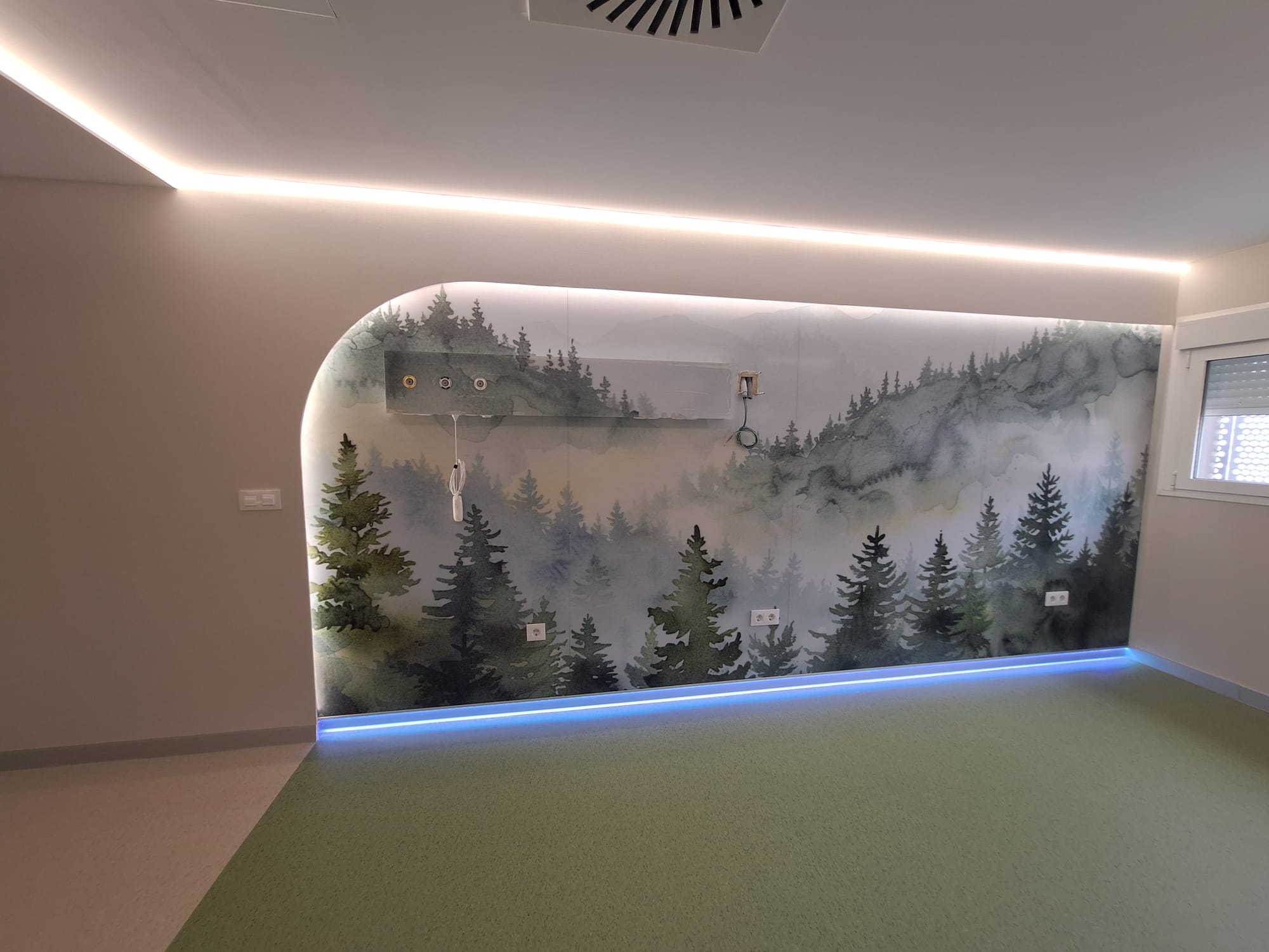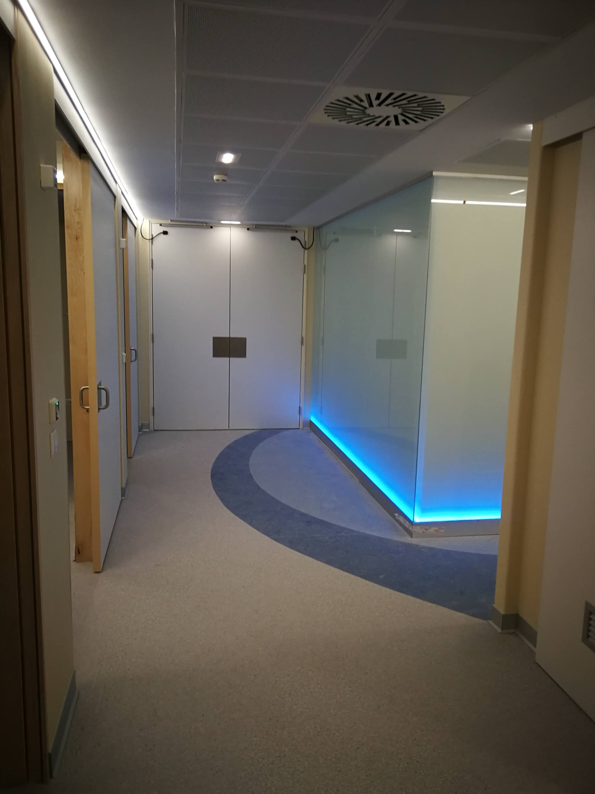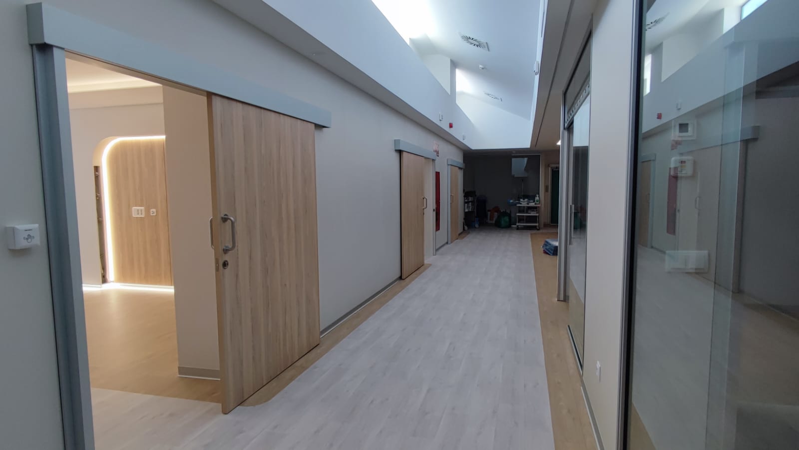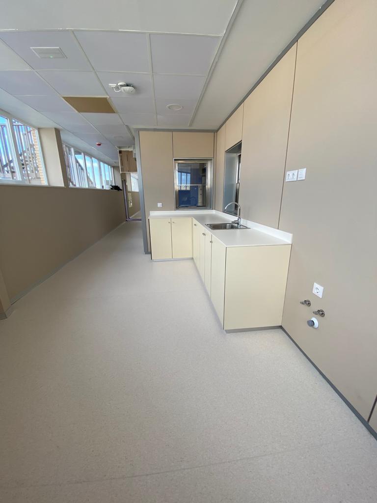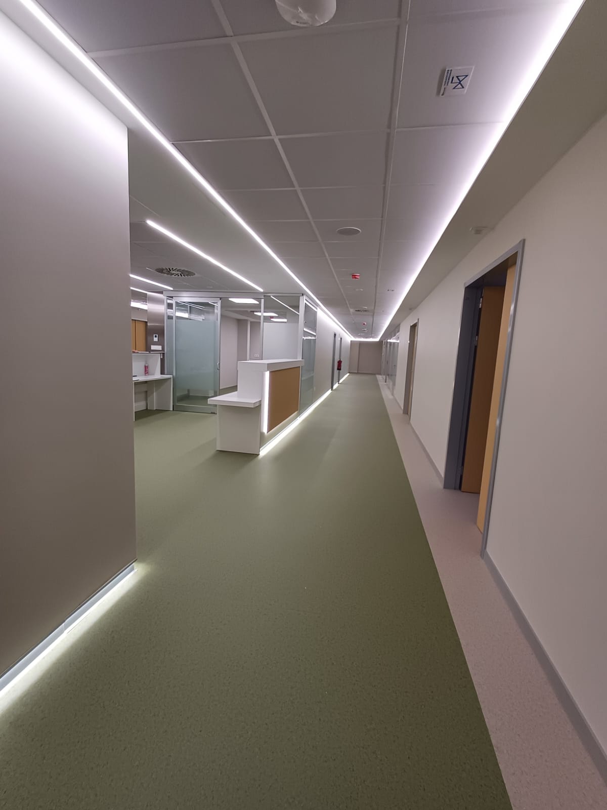 Área de Dilatación y Partos en la planta 2 del Hospital Universitario de Fuenlabrada. Madrid. La intervención consiste en la reestructuración integral del servicio de paritorios dotándolo de 5 nuevas salas de Dilatación-parto y afectando a todas las áreas de apoyo, enfermería, reanimación, exploración, etc.